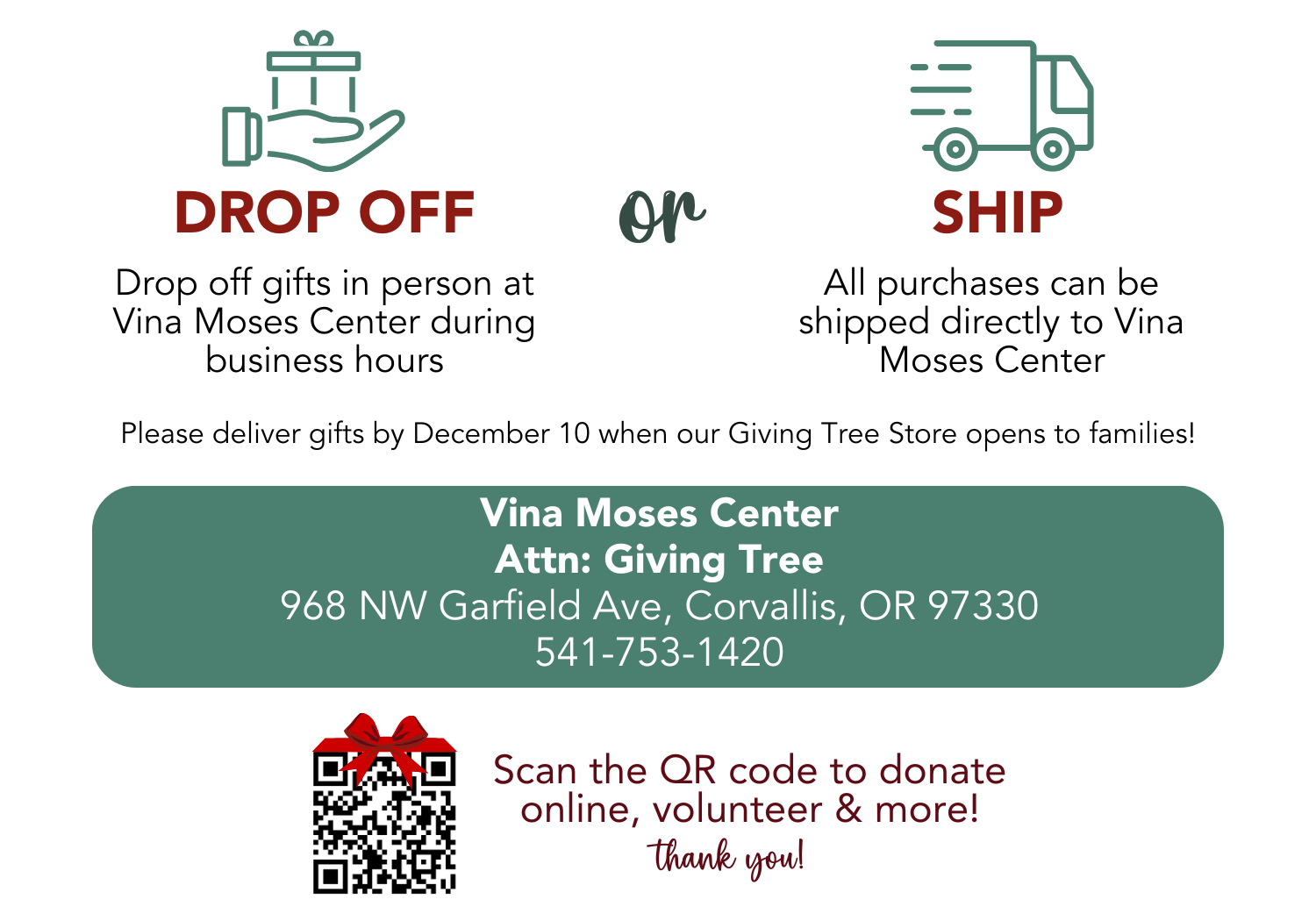 You may drop items off at Vina’s Giving Tree Store (935 NW Kings Blvd - across the street from our previous location and next to Animal Crackers!) Monday through Friday from 10am until 5pm starting December 2. Our program runs from December 10th - 16th.